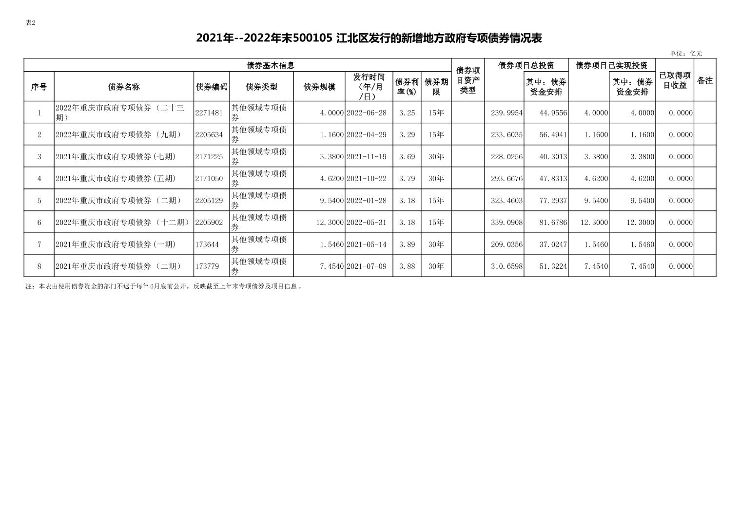 2021年--2022年末500105 江北區發行的新增地方政府專項債券情況表