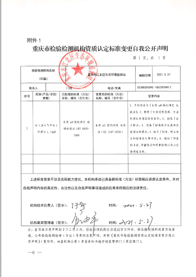 關于重慶市江北區生態環境監測站水質 pH值的測定標準變更自我公開聲明