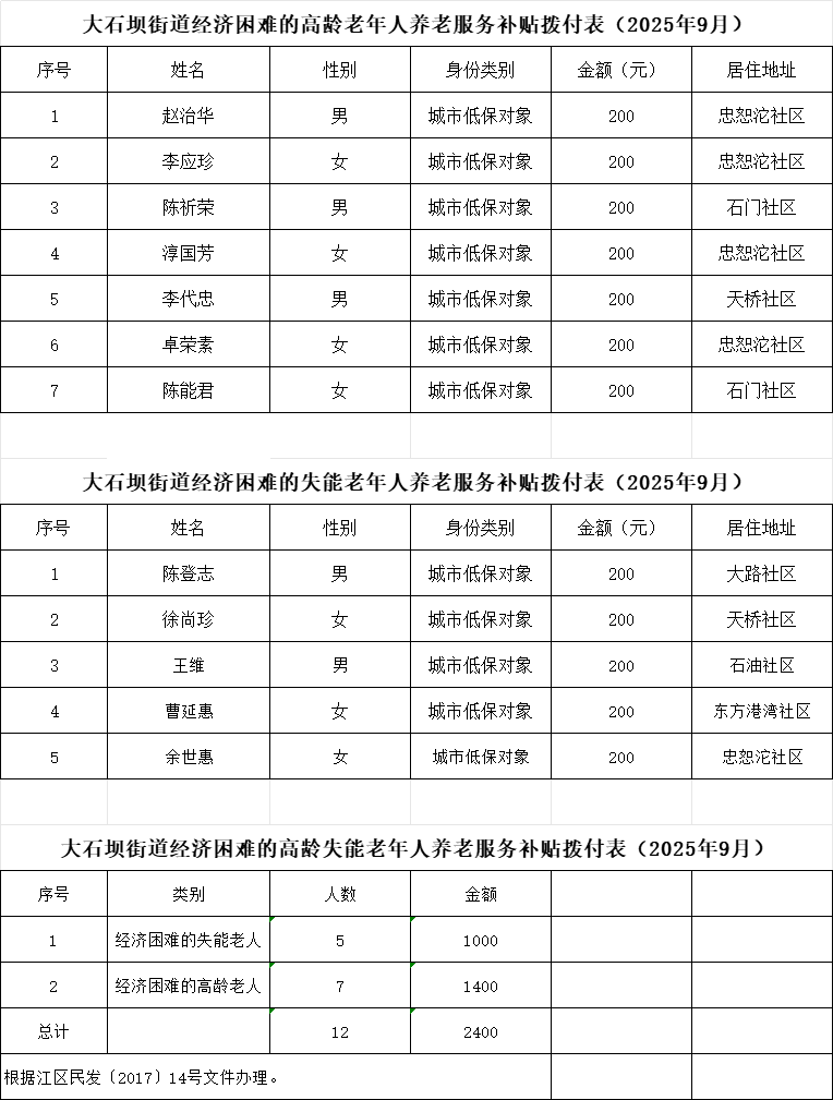 大石壩街道2025年9月經濟困難的高齡和失能老年人養老服務補貼撥付表