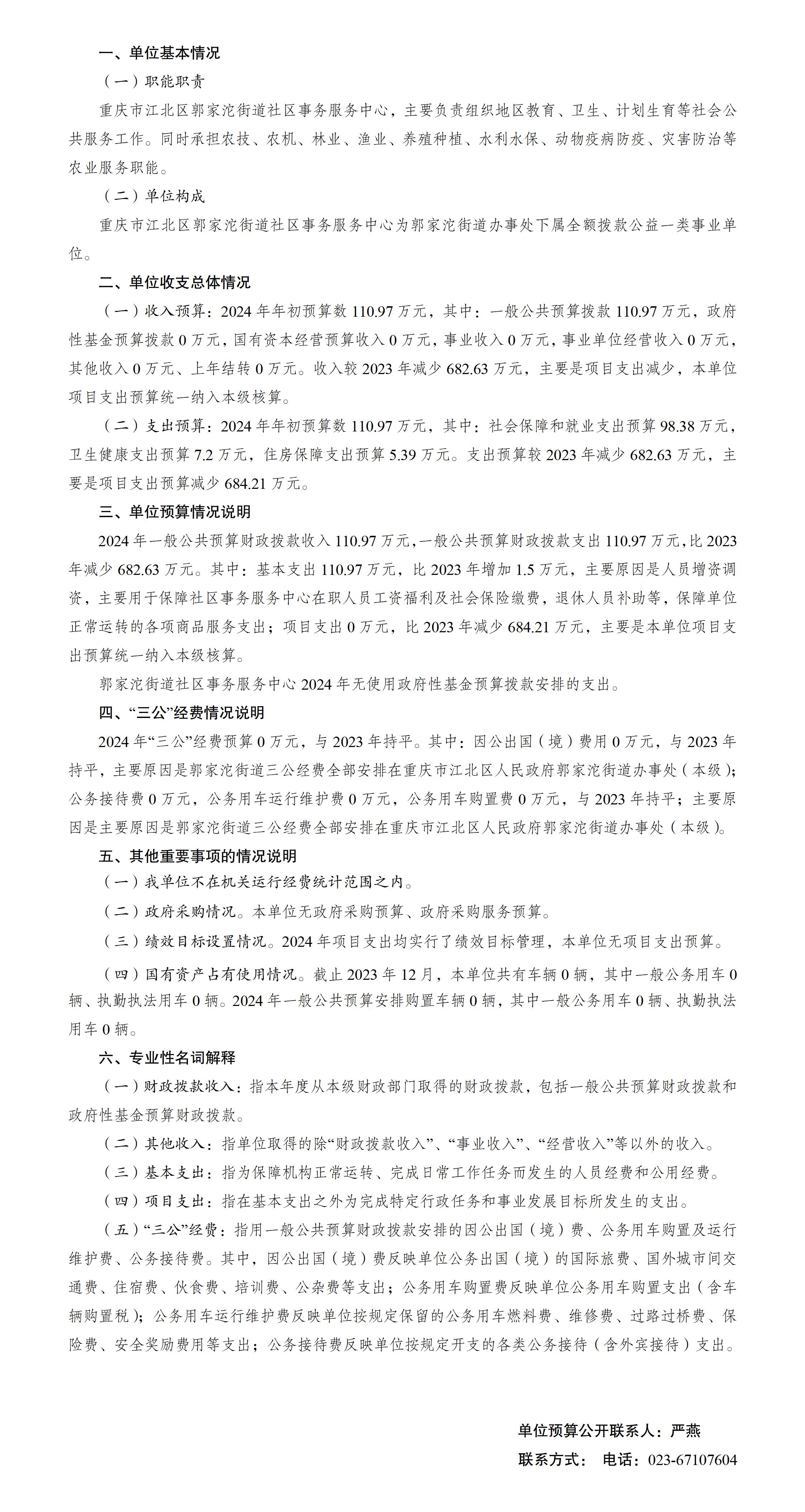 重慶市江北區郭家沱街道社區事務服務中心2024年單位預算情況說明