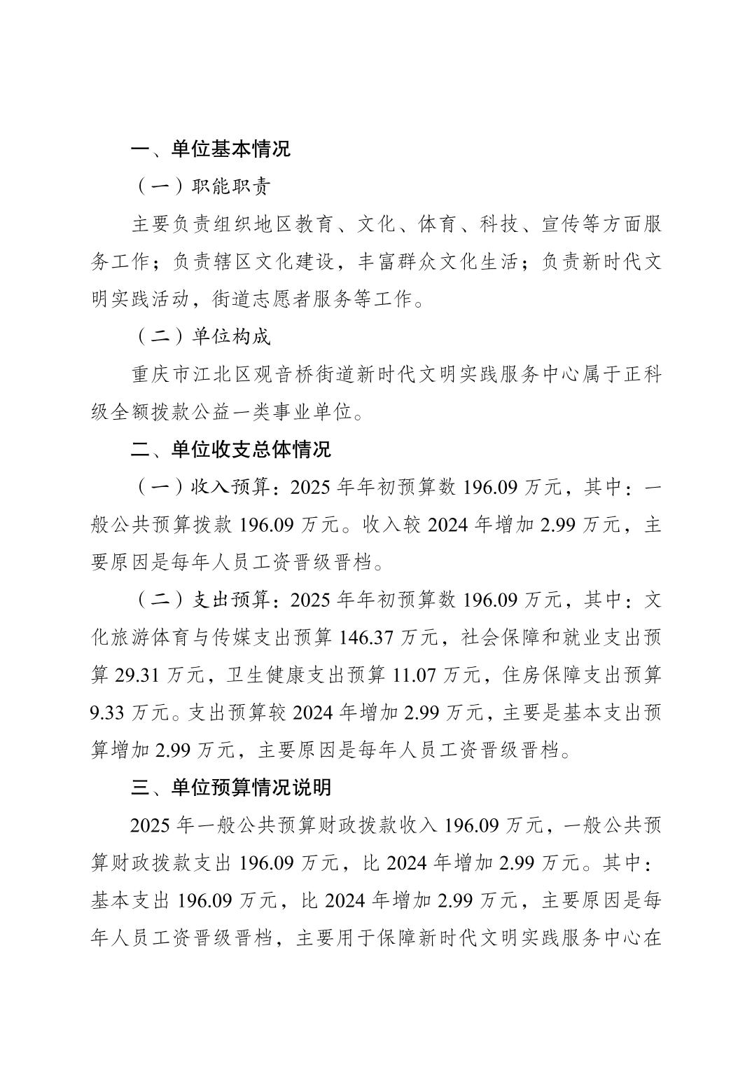 重慶市江北區觀音橋街道新時代文明實踐服務中心2025年單位預算情況說明