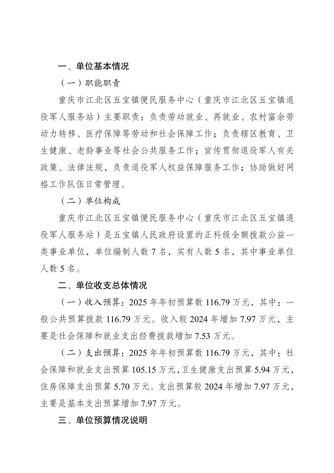 江北區五寶鎮便民服務中心(江北區五寶鎮退役軍人服務站)2025年單位預算情況說明