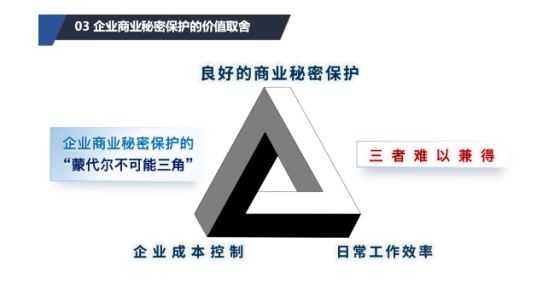 蒙代爾不可能三角又稱三元悖論,通常應用于宏觀經濟學,其本質是指基于特定的情形下,三種不同位面的價值難以同時實現,最多只能同時滿足兩個目標,而放棄另外一個目標。[19]在企業商業秘密保護中,同樣會面臨著三元悖論的局面,即“良好的商業秘密保護”,“企業成本控制”及“日常工作效率”三者之間難以兼得。例如,在基于優先保護企業商業秘密,同時兼顧企業成本的基礎之下所采取的保密措施,對企業日常運營的工作效率必然會有一定程度的影響。企業所采取常見的措施包括限制個人電腦的使用、禁用通訊軟件及設備的使用、涉密材料的接觸及借閱等需多級審批、員工離職調崗的脫密流程等。而為實現相同等級商密保護的基礎之下,降低運營行政成本提升工作效率,則勢必需要應用技術監管手段及管理體系,比如信息安全設備及配套軟件,防數據泄漏軟件,區域監控設備等,這無疑亦會增加企業運營成本。