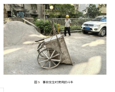 2. 人的不安全行為。作業過程中,工人往斗車裝載的石粉重量超過了專項方案中第十章計算書:“一、設備抗傾覆驗算模型”中起重重量(取100kg)的規定起吊重量。