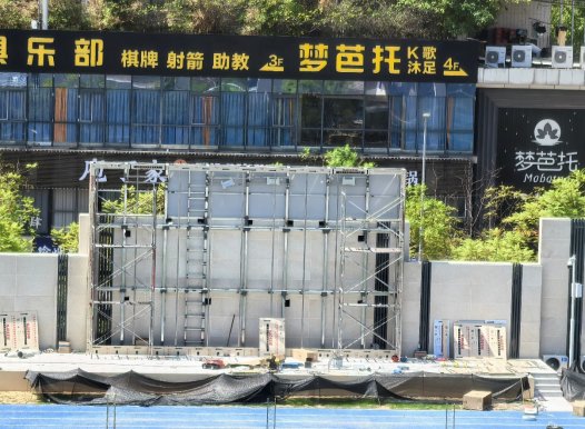 培新小學操場主席臺背景墻處準備安裝LED顯示屏,事發時已搭設好擬安裝LED顯示屏的鍍鋅鋼管架,鍍鋅鋼管架用“工字鋼”固定在背景墻上,鋼管架長約10米,高約6米。在鋼管架離地高約4米左右的位置,設置有第二層維護平臺,維護平臺長約9.5米,寬約0.7米;維護平臺后側緊靠背景墻,前側未設置防護欄。第二層維護平臺上方的背景墻上有安裝好二個空調室內機掛板,第三個掛板(從右向左)未安裝完成,呈傾斜狀。