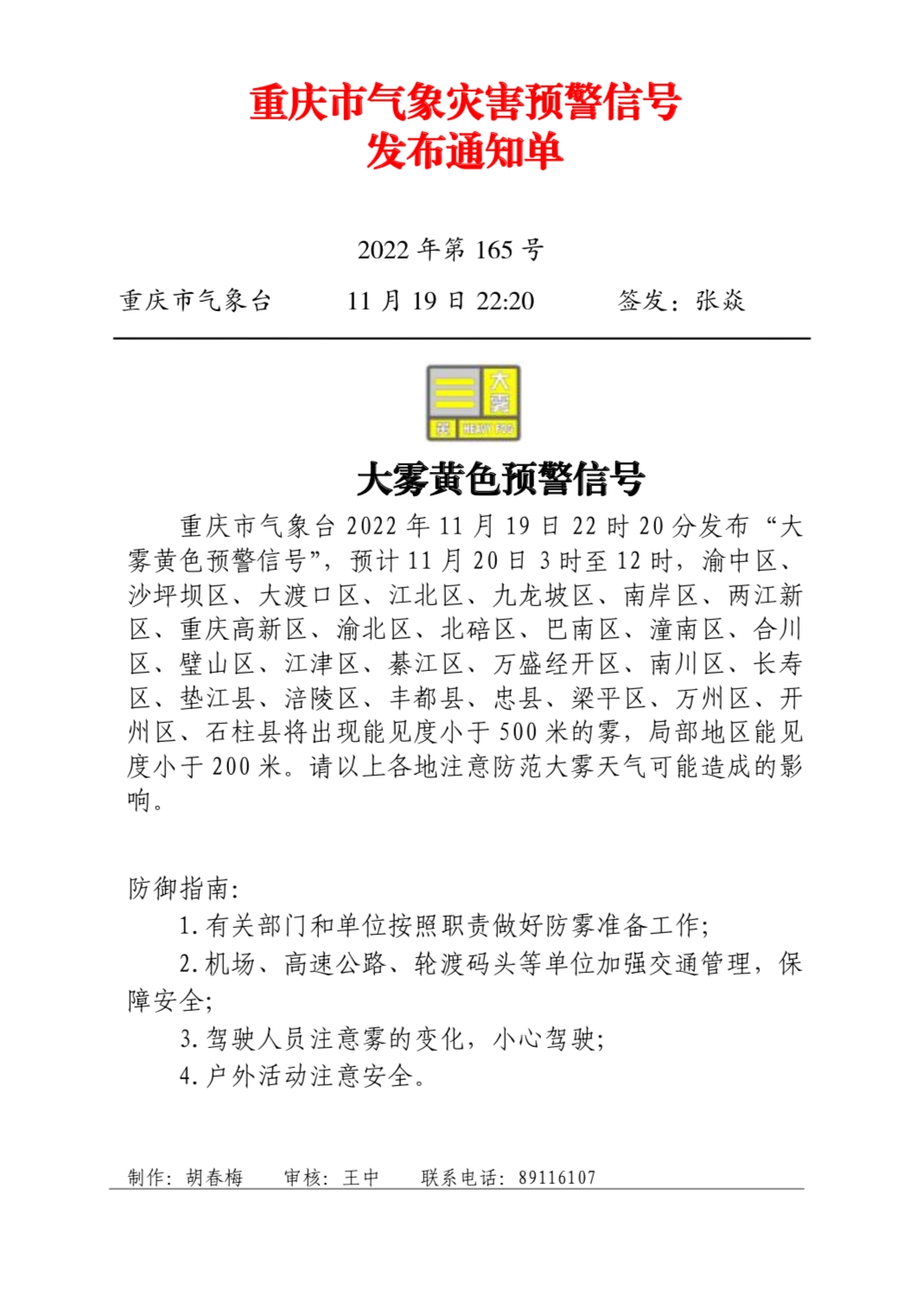 重慶市氣象災害預警信號發布通知單(2022年第165號)