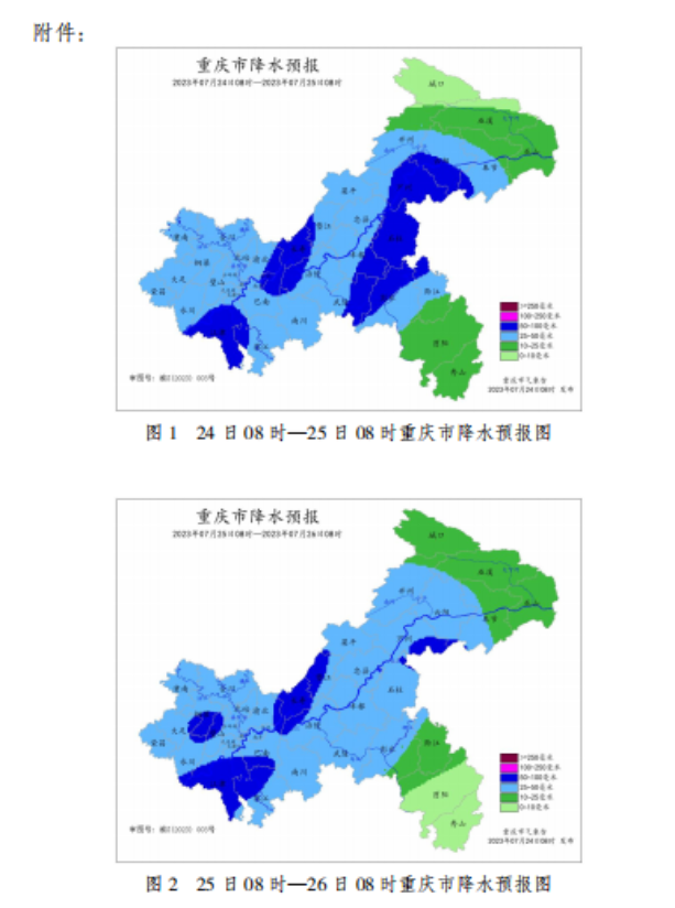 24日白天到夜間(24日08時—25日08時),各地多云轉陣 雨或雷雨,江北區、南岸區、渝北區、巴南區、江津區、綦江區、南川區、長壽區、涪陵區、墊江縣、豐都縣、萬州區、云陽縣、奉節縣、武隆區、石柱縣、彭水縣、黔江區18個區縣的部分鄉鎮有暴雨,個別鄉鎮大暴雨,其余地區中雨到大雨,雷雨時伴有短時強降水、局地陣性大風等強對流天氣,氣溫22~36℃;中心城區多云轉大雨,氣溫28~35℃。